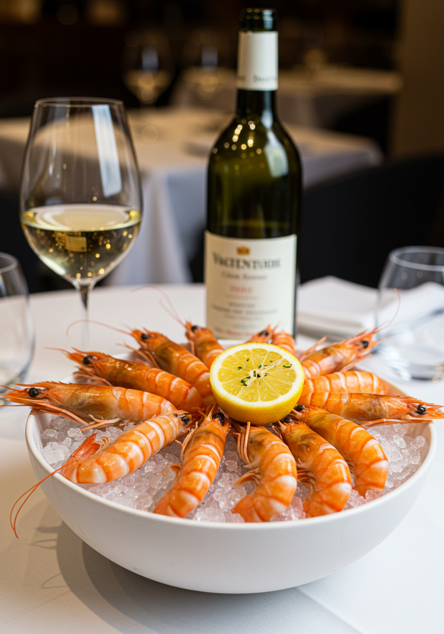 The menu features iconic dishes like Tomahawks, A5 Wagyu, and caviar alongside more whimsical offerings like Maine Lobster "Escargot" and a colossal shrimp cocktail. The Crispy Shrimp Deviled Eggs is a favorite among diners.