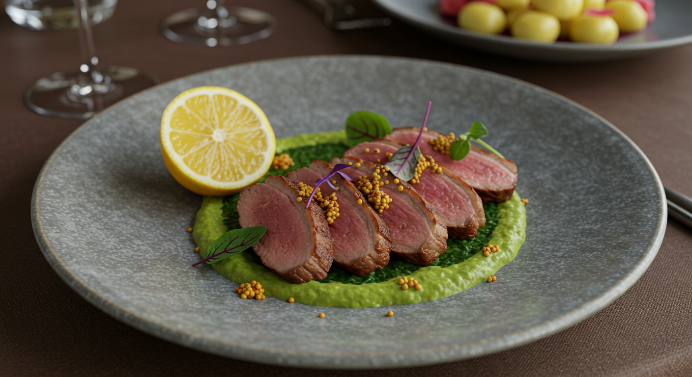 - Duck breast with tamarind puree, kumquat, and chicory