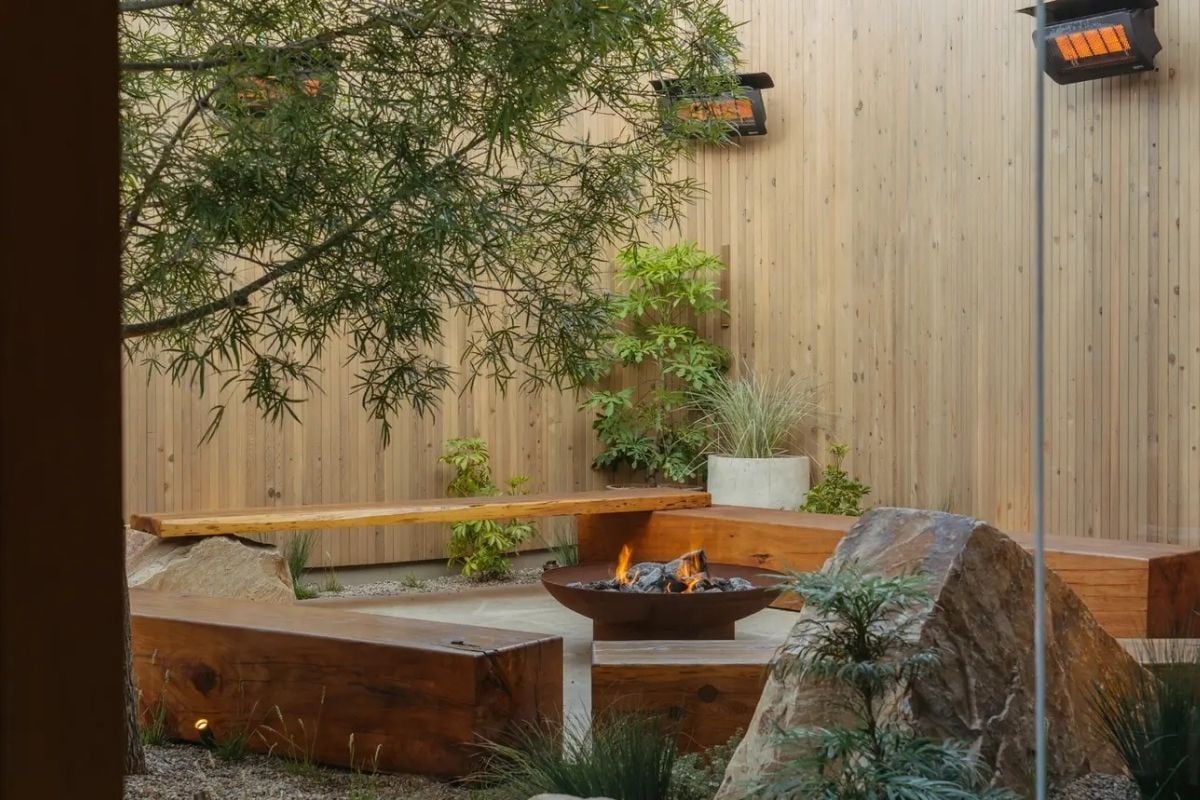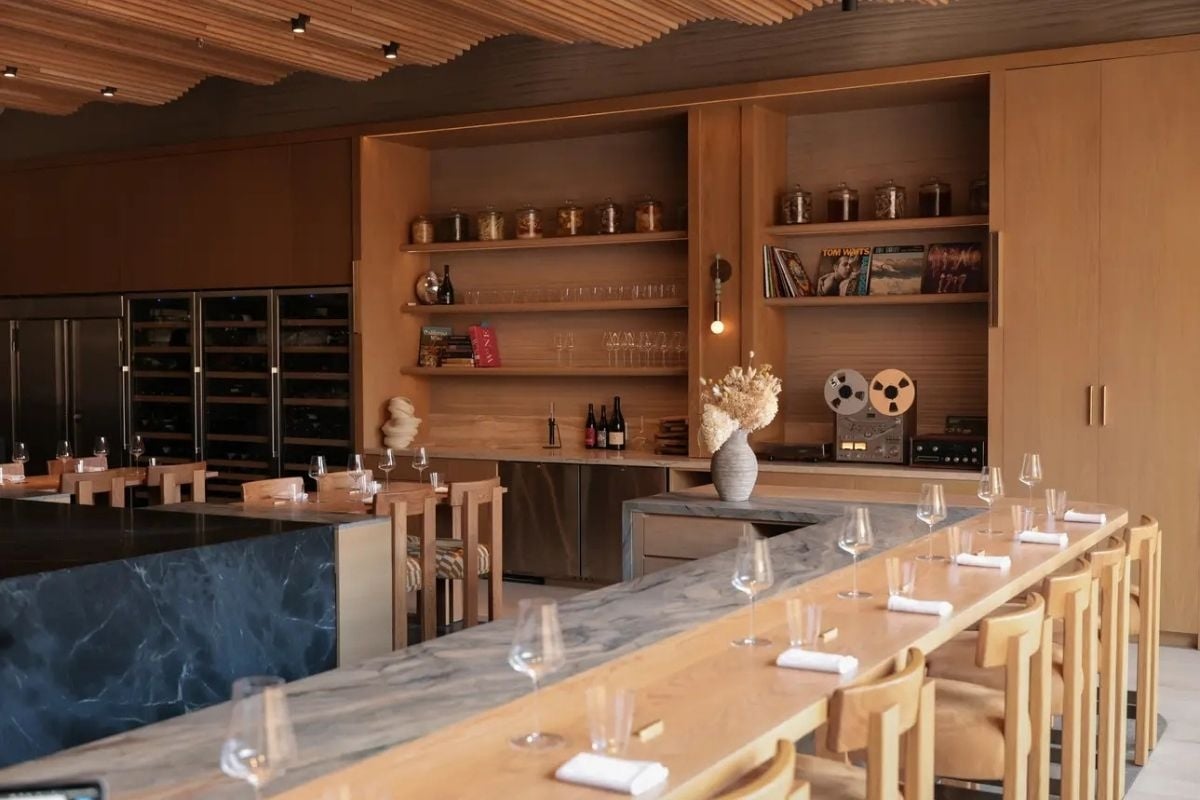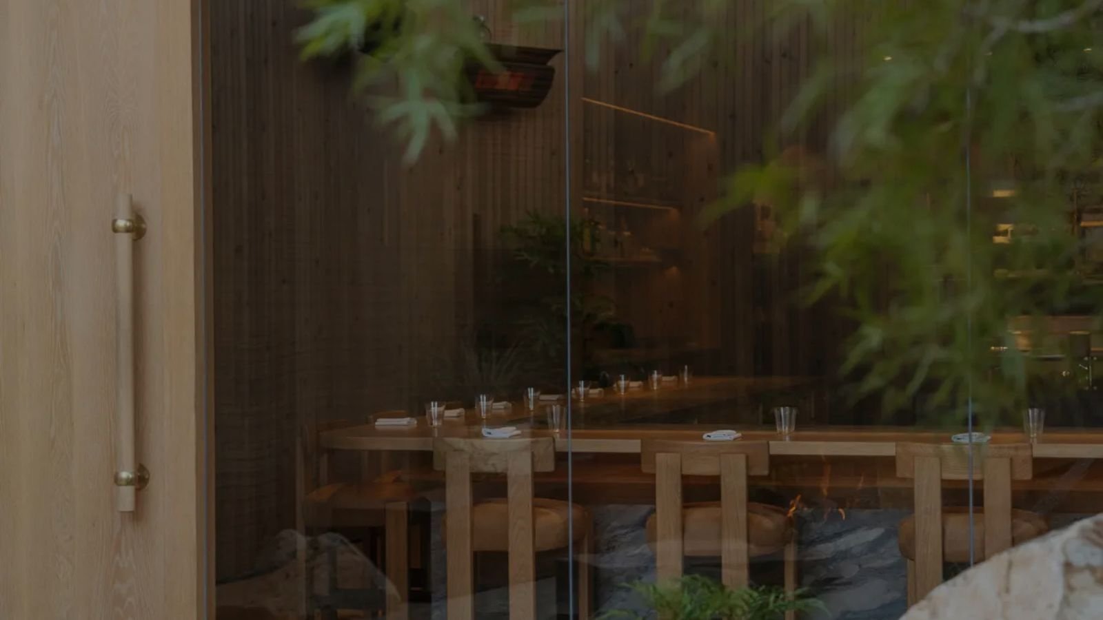 The space itself, designed by Bells + Whistles, blends oak, stone, and glass to shape a room that feels both modern and elemental. One floor-to-ceiling window looks into the courtyard, where the evening begins and ends. The warmth of the fire pit that can be seen through the window softens the room's contemporary edges. Even the seating feels intentional, side-by-side at the counter, positioned to draw focus to the kitchen but still allowing for shared conversation. It's a subtle bit of spatial psychology that makes the experience feel more participatory.