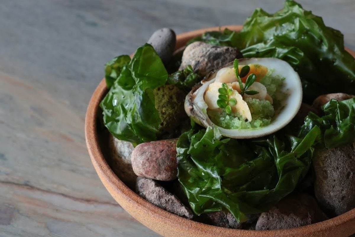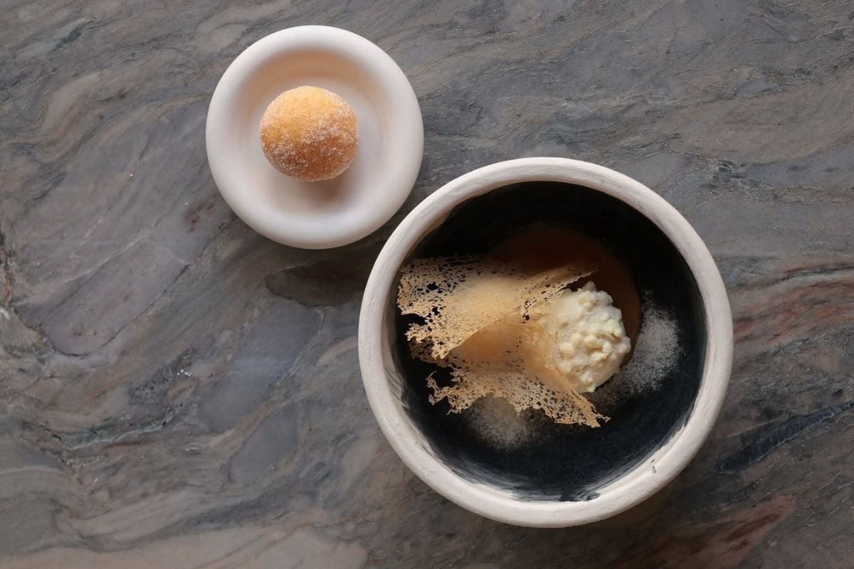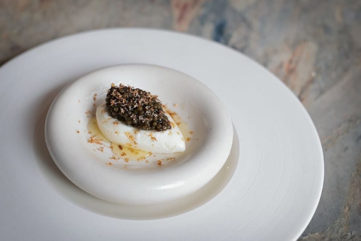 Once settled at the chef's counter, six main courses arrive one by one, and the kitchen reveals its bold instincts with each plate. Rock Crab served on ice with kohlrabi, citrus fern, marigold, and an infusion of cucumber and lime leaf. Abalone grilled over embers, brushed with fermented pepper and guanciale, tempura of brassicas, oyster emulsion, allium powder, with a broth of roasted chicken and bone marrow. Ikejime Black Cod with roses, nectarine, yuzu, and a sabayon of Pineau des Charentes.
