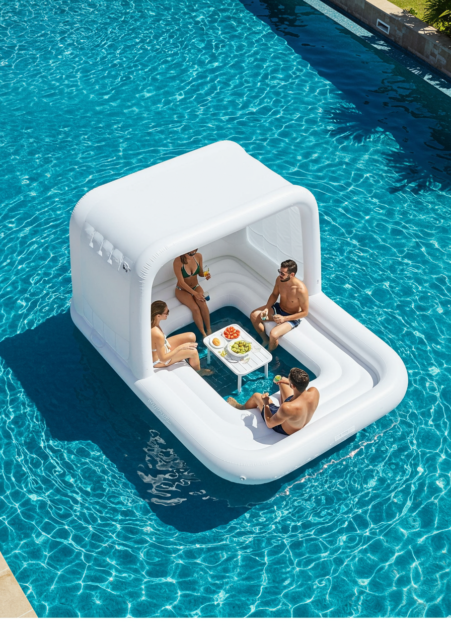 There is no better place to host your four VIPs than on your floating Cabana Dayclub. The dual mesh foot baths keep you cool, while the central storage compartment is ideal for icy drinks or speakers. With the water entry pad, getting in and out of the pool is a breeze. Cabana comes with side grab ropes, 8 handles, and a tether rope to keep you from floating away.